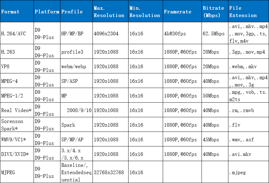 VPU可以提供高效、低功耗的視頻編解碼處理能力,主要功能包括視頻編碼、解碼、圖像處理、視頻輸出等。它可以支持多種視頻編碼格式,如H.264、H.265、VP9等,同時還可以支持多種分辨率和幀率的視頻處理。其中D9-Pro支持4Kp30視頻播放,D9-Plus、D9支持1080p60視頻播放。
