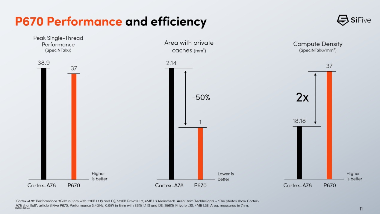 圖6. SiFive P470和P670和Arm產(chǎn)品的性能/效率對(duì)比圖