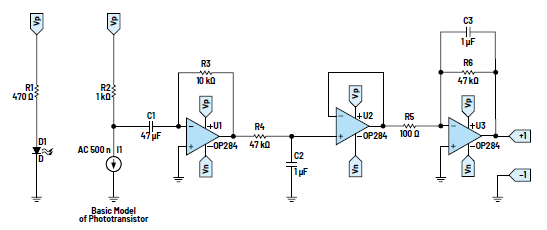 在無焊試驗板上構(gòu)建圖1所示的心跳監(jiān)測電路,該電路在LTspice®中設(shè)計。