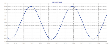 瞬態(tài):在電路的輸入端連接一個波形發(fā)生源。配置該源生成幅度為500 μV、頻率為2 Hz、偏置500 mV的正弦波。觀察輸出信號幅度,以圖形方式確定電路的總增益(圖2)。