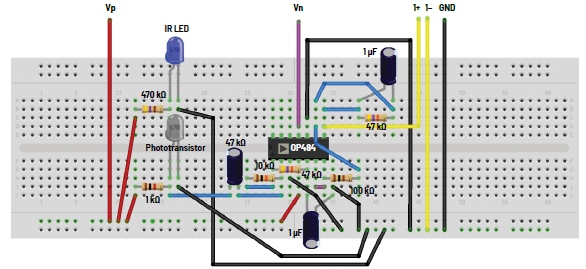 試驗板上實現(xiàn)的電路應(yīng)該類似于圖4所示電路。藍色LED代表紅外LED,灰色LED代表光電晶體管。
