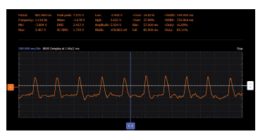 激活Scopy工具示波器功能的監(jiān)測功能,以讀取所獲得信號的頻率。如需將頻率轉(zhuǎn)換為bpm,則可使用實驗說明中的公式。