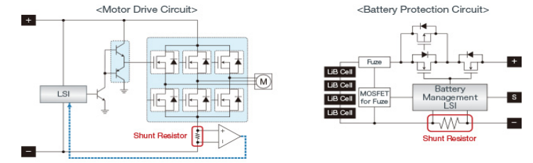 檢流電阻器可用在從低電流穿戴式設(shè)備到大功率電動(dòng)汽車等眾多應(yīng)用中。然而,無論在哪種應(yīng)用中,都適用一些通用的原則。選擇電阻器時(shí)必須考慮合適的阻抗和檢測(cè)范圍。此外,還要全面考慮電阻因發(fā)熱而產(chǎn)生的功率損耗問題。下圖展示了兩種常見的應(yīng)用,一種用于電流較大的多相電機(jī)驅(qū)動(dòng)器,另一種用于低電流的電池監(jiān)控器。