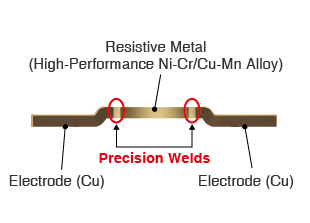 第二種方式是使用金屬合金作為電阻結(jié)構(gòu),將其直接焊接到接觸電極上。合金配方對(duì)于確定阻值及其熱特性至關(guān)重要。這種電阻結(jié)構(gòu)具有出色的功率和熱性能表現(xiàn),但其制造成本較高。下圖給出了一個(gè)示例。