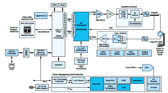 RAU是DAS中主要的關鍵功能,有助于擴展射頻容量。RAU的主要作用是實現(xiàn)數(shù)字到射頻和射頻到數(shù)字的轉換。ADI公司提供了集成度高且靈活性強的射頻收發(fā)器解決方案(如ADRV902x系列),為幫助RAU勝任復雜任務帶來了基礎集成電路器件。