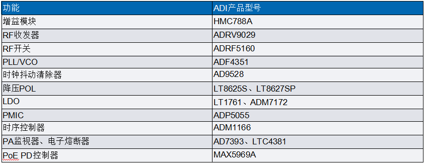 圖3顯示了典型DAS RAU的高級框圖。表1列出了一些建議的器件功能和產品型號。圖中為該平臺提供了多個具體的器件建議,但下文將僅重點關注射頻收發(fā)器、ADRV9029和一些附加電源器件。
