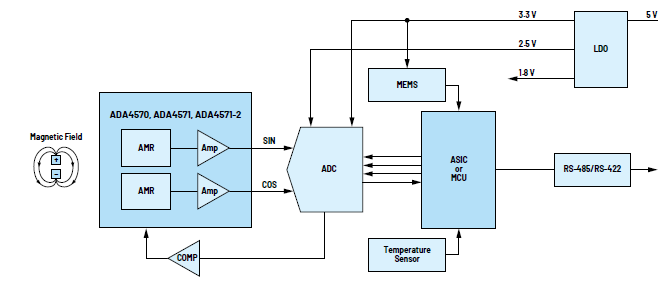 ADA4571是一款低延遲集成信號調(diào)理功能的AMR傳感器,提供單端模擬輸出。ADA4571單芯片解決方案提供良好的角度精度(典型角度誤差僅為0.10度),工作速度可高達(dá)50k rpm。ADA4571-2是雙通道版本,可提供完全冗余能力而不影響性能,適合安全關(guān)鍵型應(yīng)用。