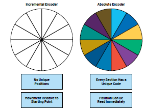 單圈絕對值編碼器在通電后會返回機械或電氣360°范圍內(nèi)的絕對位置信號。電機軸的位置可以立即讀取。多圈絕對值編碼器不僅具有絕對位置功能,而且能提供360°圈數(shù)計數(shù)。相比之下,增量編碼器提供相對于旋轉(zhuǎn)起點的位置。增量編碼器提供一個索引脈沖來指示0°,并提供一個單脈沖來計數(shù)圈數(shù),或提供一個雙脈沖來提供方向信息。
