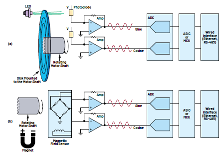 編碼器通過跟蹤旋轉(zhuǎn)軸的速度和位置來提供閉環(huán)反饋信號。光學(xué)和磁編碼器技術(shù)使用非常廣泛,如圖2所示。在通用伺服驅(qū)動器中,編碼器用于測量軸位置,從中可推導(dǎo)出驅(qū)動器轉(zhuǎn)速。機器人和離散控制系統(tǒng)需要準(zhǔn)確且可重復(fù)的軸位置。光學(xué)編碼器由帶有精細(xì)光刻槽的玻璃圓盤組成。當(dāng)光穿過圓盤或從圓盤反射時,光電二極管傳感器檢測光的變化。光電二極管的模擬輸出經(jīng)過放大和數(shù)字化處理后,通過有線電纜發(fā)送到逆變器控制器。磁編碼器由安裝在電機軸上的磁體和磁場傳感器組成,傳感器提供正弦和余弦模擬輸出,輸出經(jīng)過放大和數(shù)字化處理。光學(xué)和磁傳感器信號鏈類似,如圖2所示。