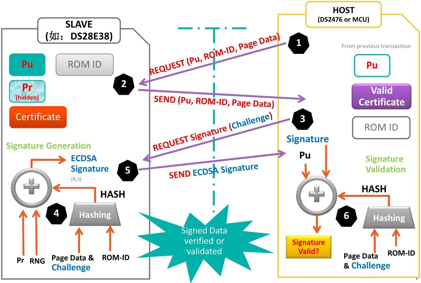 該器件提供一組源自集成塊的核心加密工具,包括非對(duì)稱硬件引擎、真隨機(jī)數(shù)生成器(TRNG)、3Kb安全EEPROM、遞減計(jì)數(shù)器和唯一的64位ROM標(biāo)識(shí)號(hào)(ROM ID)。ECC公鑰/私鑰功能根據(jù)NIST定義的P-256曲線運(yùn)行,以提供符合FIPS186的ECDSA簽名生成功能,以支持雙向非對(duì)稱密鑰身份驗(yàn)證模型,擁有強(qiáng)大的對(duì)策防止安全攻擊。