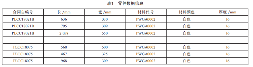 根據(jù)某制定化企業(yè)的生產(chǎn)情況,選取了5個(gè)不同批次的生產(chǎn)訂單,為滿足零件排樣要求,將所有訂單數(shù)據(jù)按照零件尺寸、材料進(jìn)行整理,表1為其中一個(gè)批次的部分訂單數(shù)據(jù)信息。