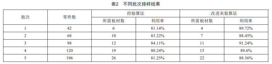 在不同的排樣批次中,為了較充分地比較算法的有效性,分別選取了不同零件規(guī)模的算例,零件個(gè)數(shù)從42個(gè)到196個(gè)不等,將本文中的改進(jìn)灰狼算法和企業(yè)訂單分批后所使用的經(jīng)驗(yàn)算法進(jìn)行比較,板材利用率均有不同程度的提升,分別提升了8.58%、5.23%、7.13%、9.36%和7.31%,對應(yīng)批次所需板材的數(shù)量分別減少2、3、1、4和4塊。改進(jìn)的灰狼算法較經(jīng)驗(yàn)算法利用率有較大的提升,減少了企業(yè)生產(chǎn)成本,提高了企業(yè)的生產(chǎn)效益。