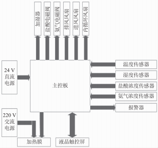 鹽酸氨氣試驗箱的電路主要由7個部分組成,分別是供電電源(有220V和24V兩部分)、主控板、傳感器部分(系統(tǒng)配有溫度傳感器、濕度傳感器、氨氣濃度傳感器、鹽酸濃度傳感器)、液晶觸控屏、電磁閥部分(包括鹽酸電磁閥和氨氣電磁閥)、風扇部分(進風風扇和內(nèi)循環(huán)風扇)、加熱及加濕部分,其結(jié)構(gòu)框圖如圖3所示。