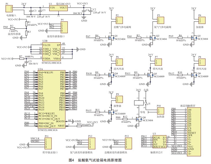 鹽酸氨氣試驗箱電路原理圖如圖4所示,主控板外接24V電源,采用sTM32L100C6U6型號的微處理器(如圖中的U2A和U2B),封裝為UFOFPN-48,該封裝可節(jié)省主控板的面積,使主控板做得更小。該款處理器主頻36MHz,足夠?qū)崿F(xiàn)液晶屏顯示、電磁閥和風扇的通斷控制、程序邏輯處理、傳感器輪詢檢測等功能。