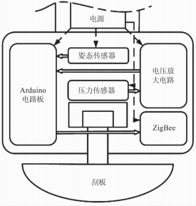 本文設(shè)計的智能刮痧儀采用一體化集成設(shè)計,由Arduino板、壓力傳感器、姿態(tài)傳感器、ZigBee無線傳輸模塊、系統(tǒng)電源等組成,能實時監(jiān)測、記錄并上傳刮痧儀在使用者刮痧過程中的速度、壓力及傾斜角,以實現(xiàn)對刮痧操作的量化和數(shù)據(jù)化。信息傳輸流程如圖1所示。