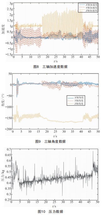 啟動電腦端程序和刮痧儀后,將ZigBee模塊接入電腦并與刮痧儀的串口匹配。確認刮痧儀已與電腦連接后,進行正常的刮痧操作。其間壓力傳感器將持續(xù)采集信息,并將采集到的壓力信息經(jīng)過電壓放大電路進行放大后傳輸給單片機,姿態(tài)傳感器將加速度及旋向等數(shù)據(jù)傳給單片機,單片機把這些數(shù)據(jù)處理后通過ZigBee傳給上位機,并通過上位機程序?qū)?shù)據(jù)可視化顯示出來,如圖8、圖9、圖10所示。