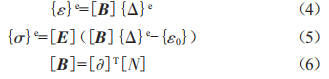 A式:[B]為單位應(yīng)變矩陣:[E]為材料的彈性常數(shù)矩陣:{s0}為初始應(yīng)變。