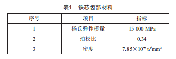 (4)定子鐵芯。定子鐵芯采用塊體單元建模,由于鐵芯是由沖片靠螺栓預(yù)緊力固定的,等效彈性模量小于鋼的彈性模量,一般取值1.5×105MPa。