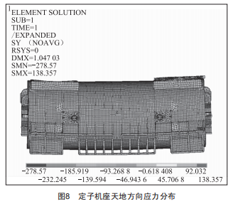 (2)在重力作用下,定子機(jī)座在天地方向應(yīng)力分布如圖8、圖9所示,最大拉應(yīng)力104MPa,小于屈服極限的1/2,安全。