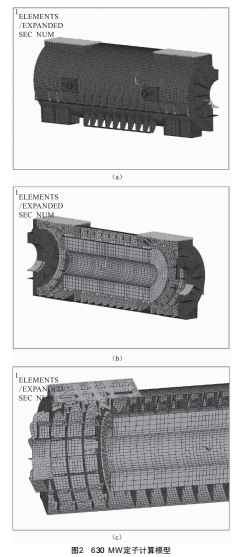 利用有限元軟件,建立630MW汽輪發(fā)電機(jī)定子機(jī)座、定子鐵芯及端蓋的聯(lián)合模型,在模型式采用塊體單元、板殼單元、梁?jiǎn)卧?、質(zhì)量單元來(lái)模擬,在不影響分析計(jì)算精度的前提下,將幾何模型進(jìn)行如下簡(jiǎn)化:對(duì)薄壁零件進(jìn)行式面抽取,使用殼單元進(jìn)行仿真、去除幾何模型式的所有螺栓孔。建立的模型如圖2所示。