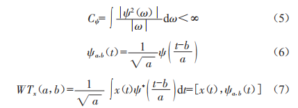 小波分析用某小波函數(shù)族來(lái)表示觀測(cè)信號(hào),它能實(shí)現(xiàn)對(duì)信號(hào)的整體和局部分析,符合對(duì)非平穩(wěn)信號(hào)特性分析的要求,具有特征參數(shù)選取的有效性。小波函數(shù)定義為:設(shè)w(1)為平方可積函數(shù),即w(1)∈L2(R),若其傅里葉變換w(o)滿足條件小波函數(shù)的可容許條件,即公式(5)所示,則w(1)為一個(gè)基本小波。將基本小波w(1)伸縮和平移,代入伸縮因子a和平移因子b,即公式(6)所示,可得到小波基函數(shù)。x(1)的連續(xù)小波變換為w7x(a,b),即公式(7)所示。