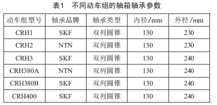 不同型號(hào)的動(dòng)車組使用的軸箱軸承也不同。目前,選用較多的軸承類型為內(nèi)徑130mm、外徑230mm/240mm的圓錐滾子軸承,該軸承能承受一定的軸向載荷和徑向載荷,不同類型和品牌的軸承參數(shù)如表1所示。如我國(guó)CRH380A型動(dòng)車組轉(zhuǎn)向架采用脂潤(rùn)滑密封型雙列圓錐滾子軸承,此單套軸箱軸承承受的軸向載荷為20kN,徑向載荷為90kN。