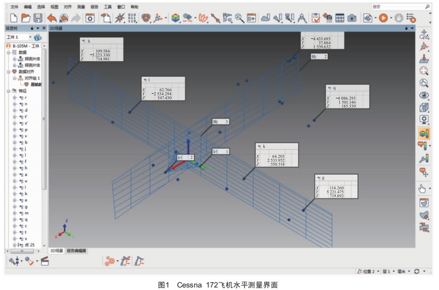 首先選取合適的測量位置,利用激光跟蹤儀遠程控制、自動目標搜索和跟蹤的特點,對飛機一側(cè)的測量點進行連續(xù)測量。然后布置轉(zhuǎn)站點,用反射球測量轉(zhuǎn)站點坐標,利用Polyworks軟件實現(xiàn)激光跟蹤儀的轉(zhuǎn)站,將左右測量點的數(shù)據(jù)都擬合在一個空間坐標系中,完成飛機另一側(cè)各測量點的測量,測量界面如圖1所示。利用Polyworks軟件對各測量點坐標數(shù)據(jù)進行處理、輸出,對測量數(shù)據(jù)進行后期處理,得到能直觀表現(xiàn)Cessna172飛機機翼、尾翼、機身等形面狀況的特征參數(shù),實現(xiàn)對Cessna172飛機結(jié)構(gòu)變形情況的準確評估。