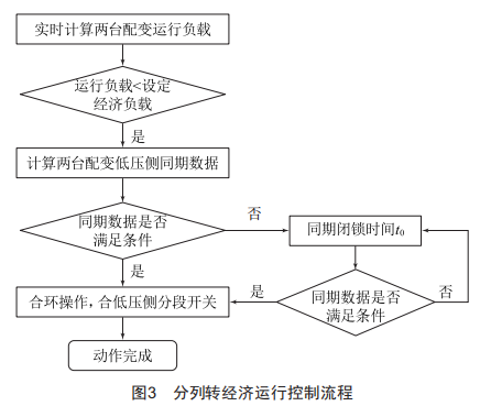 動作過程如下:在系統(tǒng)充電狀態(tài)下,當兩臺變壓器疊加負載小于經(jīng)濟運行負載,持續(xù)時間大于啟動經(jīng)濟運行時間后,啟動變壓器分列運行轉(zhuǎn)至經(jīng)濟運行動作。具體動作流程如圖3所示。