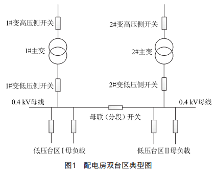 目前,新建住宅配電房主要采用的是雙臺區(qū)設(shè)計,即配電房配備兩臺變壓器,由兩條來自不同電源的10kV線路供電,兩路電源分列運行,各自帶低壓負載。圖1為主流的雙臺區(qū)典型設(shè)計架構(gòu)。