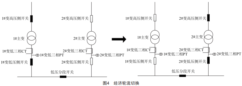 在運行過程中,實時判定工作主變低壓側(cè)負載。當負載在一段時間內(nèi)持續(xù)小于變壓器經(jīng)濟負載占比時,啟動變壓器輪流切換功能,如圖4所示。在切換過程中,保證低壓側(cè)母線不失電,同時保證合環(huán)運行時間小于200ms,避免兩臺變壓器長時間合環(huán)運行造成其他不良影響。
