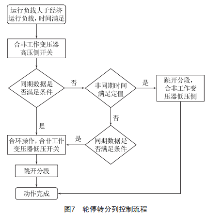 在運行過程中,實時判定工作主變低壓側(cè)負載。當負載在一段時間內(nèi)持續(xù)大于變壓器經(jīng)濟負載時,啟動變壓器經(jīng)濟運行轉(zhuǎn)分列運行功能,如圖6所示。在切換過程中,保證低壓側(cè)母線不失電,同時保證合環(huán)運行時間小于200ms。