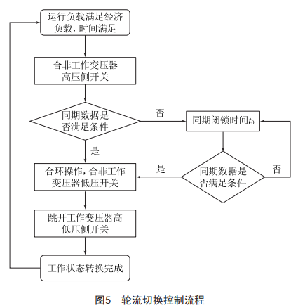 動作過程如下:在充電狀態(tài)下,當工作變壓器持續(xù)工作滿足變壓器輪換時間,并且工作變壓器負載始終小于經(jīng)濟運行負載后,啟動變壓器輪流運行。具體動作流程如圖5所示。