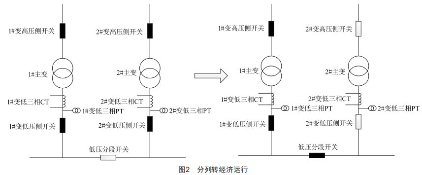在運行過程中,實時判定兩臺配變綜合負載率,并進行疊加計算。當兩臺變壓器疊加負載率在一段時間內(nèi)持續(xù)小于變壓器經(jīng)濟負載率時,滿足經(jīng)濟運行切換條件,啟動變壓器分列運行轉(zhuǎn)經(jīng)濟運行功能,如圖2所示。在切換過程中,為保證低壓側(cè)母線不失電,使用并聯(lián)切換方式,保證合環(huán)運行時間小于2.00s,避免兩臺變壓器長時間合環(huán)運行造成其他不良影響。