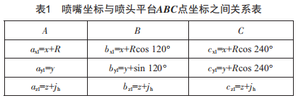 設(shè)噴嘴坐標(biāo)為)x,y,:),噴頭平臺(tái)三點(diǎn)坐標(biāo)A(ax1,ay1,az1),B(bx1,by1,bz1),C(cx1,cy1,cz1)。根據(jù)三角函數(shù)關(guān)系,易得出噴嘴坐標(biāo)與噴頭平臺(tái)A、B、C點(diǎn)坐標(biāo)之間的關(guān)系,jh為打印噴頭高度,R為噴頭平臺(tái)外接圓半徑,關(guān)系如表1所示。