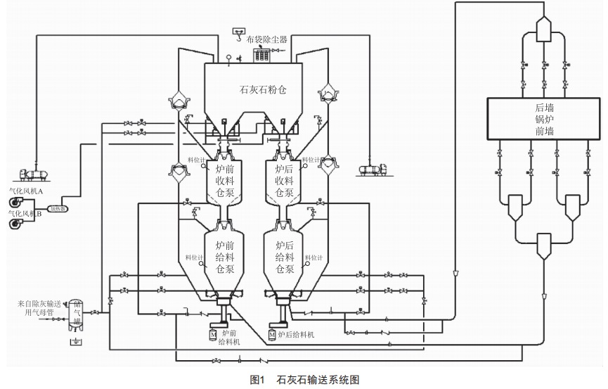 為了保證石灰石系統(tǒng)穩(wěn)定長期運(yùn)行,滿足環(huán)保排放新要求,電廠實(shí)施了鍋爐脫硫石灰石輸送系統(tǒng)的改造,改造保留原石灰石粉倉,將原石灰石粉倉的下料口由原來的單下料口擴(kuò)口改造為褲衩型雙下料口,并分別在兩個下料口各布置了一套給料機(jī)出力為15t/G的石灰石輸送系統(tǒng)(系統(tǒng)包含進(jìn)氣系統(tǒng)、給料系統(tǒng)、管道輸送系統(tǒng)、控制系統(tǒng)等)。在鍋爐正常運(yùn)行過程中,石灰石粉倉的石灰石粉通過重力進(jìn)入石灰石輸送系統(tǒng)的倉泵,通過兩個倉泵交替進(jìn)料,將石灰石粉通過變頻給料機(jī)和氣力輸送管線輸送至鍋爐前后墻附近,然后通過各支路分別從爐后分離器回料閥和前墻二次風(fēng)口噴入爐膛內(nèi)部,實(shí)現(xiàn)爐內(nèi)噴鈣脫硫的目的。石灰石輸送系統(tǒng)結(jié)構(gòu)如圖1所示,系統(tǒng)改造對原粉庫增加氣化加熱系統(tǒng),石灰石系統(tǒng)輸送流程如圖2所示。