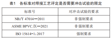 綜上,各標(biāo)準對焊接工藝評定是否需要沖擊試驗的限定如表1所示。