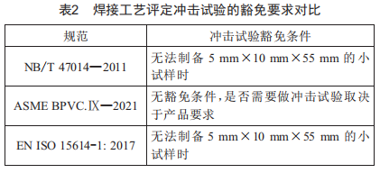 綜上,國際主流承壓設(shè)備焊接工藝評定規(guī)范對沖擊試驗的豁免要求如表2所示。