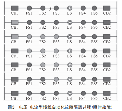 (1)電壓二電流型饋線自動(dòng)化故障隔離過(guò)程如圖3所示(瞬時(shí)故障)。圖3電壓二電流型饋線自動(dòng)化故障隔離過(guò)程(瞬時(shí)故障)