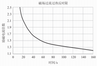 磁場(chǎng)過(guò)流過(guò)熱限制是用于調(diào)相機(jī)勵(lì)磁電流超過(guò)其最大長(zhǎng)期連續(xù)運(yùn)行電流時(shí)對(duì)勵(lì)磁電流的限制,防止長(zhǎng)時(shí)間過(guò)流導(dǎo)致過(guò)熱,損壞調(diào)相機(jī)勵(lì)磁繞組。勵(lì)磁繞組發(fā)熱與勵(lì)磁電流二次方和持續(xù)時(shí)間的乘積成正比關(guān)系,即勵(lì)磁電流及其允許運(yùn)行時(shí)間成反時(shí)限特性曲線,如圖1所示。