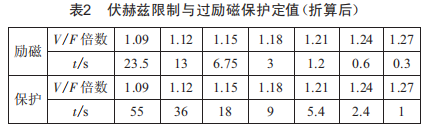 由于每?jī)牲c(diǎn)之間的動(dòng)作關(guān)系為線性直線,故可計(jì)算出伏赫茲限制在保護(hù)動(dòng)作點(diǎn)對(duì)應(yīng)的動(dòng)作時(shí)間,以便進(jìn)行直觀比較,如表2所示。