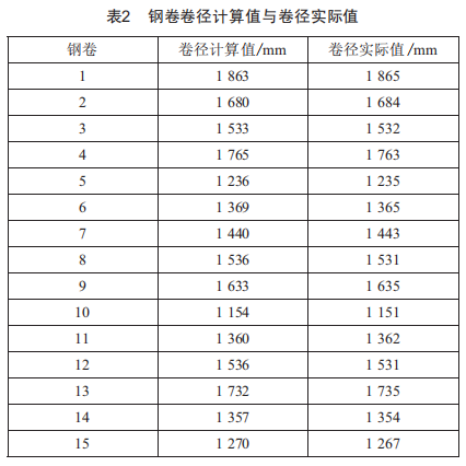 隨機選取l5個304不銹鋼卷進行測試,并將開卷機壓銀測量的卷徑值與實際值進行對比,精度可達99.7%,結(jié)果如表2所示。實際數(shù)據(jù)證明,通過運用多點擬合非線性卷徑測量曲線,能提高鋼卷初始卷徑的測量精度,減小偏差,很大程度上提升了初始轉(zhuǎn)矩給定值的準(zhǔn)確性,解決了起步過程中張力不穩(wěn)帶來的入口段彈跳銀上限位問題。開卷機運行過程中系統(tǒng)計算的卷徑值和實際卷徑值相符,沒有出現(xiàn)張力波動抽帶斷帶問題,運行平穩(wěn)。