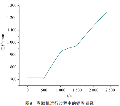 對于實際運行中鋼卷卷徑的計算進行現(xiàn)場測試,結(jié)果如圖9所示。整個生產(chǎn)過程中卷徑未因銀面打滑而發(fā)生卷徑計算值突變,過程平穩(wěn)可靠。