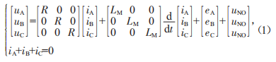 式中:uA、uB、uC為電機定子繞組端電壓:u+N為中性點電位:R為電機定子電阻:iA、iB、iC為電機定子電流:LM為電機定子繞組綜合電感:eA、eB、eC為電機反電動勢。