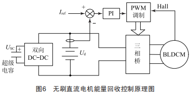 假定電機鐵芯未飽和,繞組完全對稱,帶有能量回饋控制的無刷直流電機與電源系統(tǒng)數(shù)學模型如圖1所示,該系統(tǒng)由無刷直流電機、驅動控制器、車載蓄電池、雙向DC-DC裝置以及超級電容等部分組成。