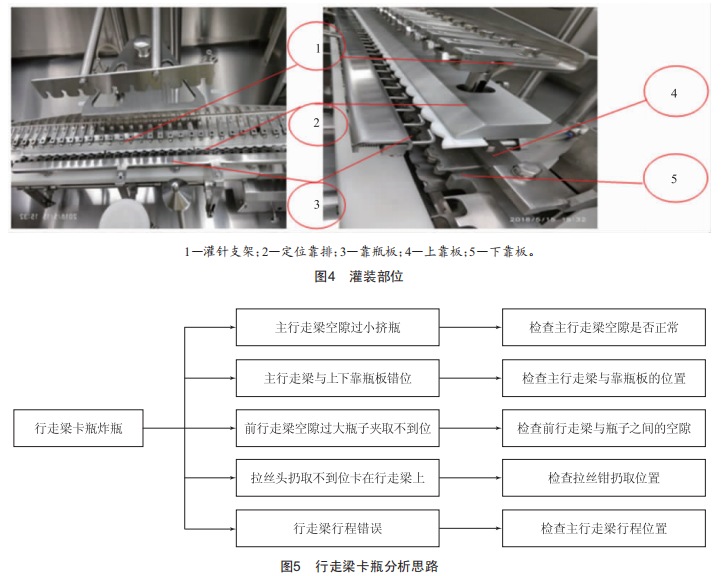 (1)如圖4所示,灌封機定位靠排2與上靠板4、下靠板5不在一條直線上,安部瓶歪斜:調(diào)整灌封機定位靠排2與上靠板4、下靠板5,使安部瓶豎直。