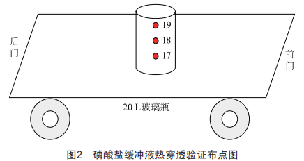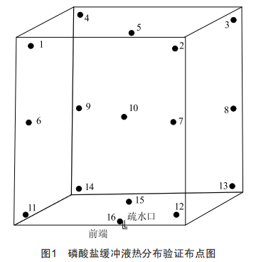 首先對(duì)磷酸鹽的緩沖液裝載量進(jìn)行評(píng)估,按照已完成最大量液體裝載要求,即每次使用10個(gè)20L玻璃瓶進(jìn)行滅菌工作,對(duì)液體受熱情況以及受熱作用時(shí)間進(jìn)行分析,并按照滅菌難易程度,得出使用1瓶緩沖液作為脈動(dòng)真空滅菌器最小裝載量,受熱更為充分,瓶?jī)?nèi)液體蒸發(fā)理論上更為明顯,故將此液體程序最小裝載量設(shè)置為1瓶緩沖液,液體濃度與正常生產(chǎn)濃度一致,按照pH為7和氯化鈉含量7.3g/L配制磷酸鹽緩沖液。將磷酸鹽緩沖液配制好后,按照均勻性布點(diǎn)要求執(zhí)行脈動(dòng)真空滅菌器熱分布布點(diǎn),熱分布點(diǎn)位布置如圖1所示。