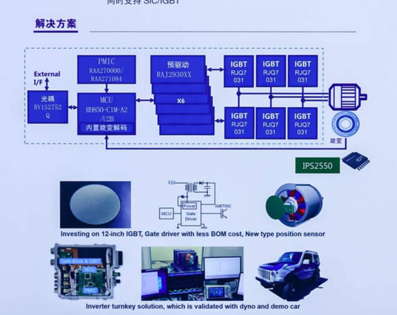 在主驅(qū)逆變器的方案中,瑞薩電子展出的一款Turn-key的方案受到了大家的關(guān)注,這一解決方案據(jù)稱能夠?yàn)殡p電機(jī)控制最頂級(jí)驅(qū)動(dòng)效率。
