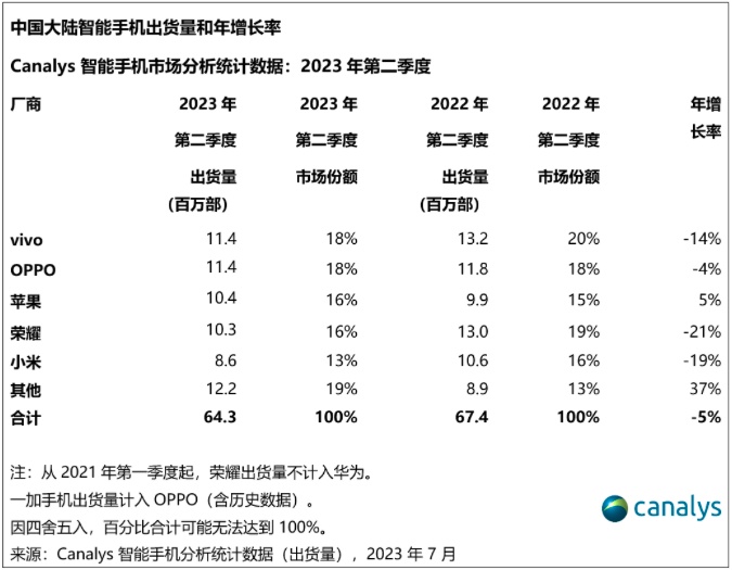 2023年7月28日,市場調(diào)研機構(gòu)Canalys發(fā)布的最新數(shù)據(jù)顯示,2023年第二季度,中國智能手機市場出貨量約6430萬臺,同比下降5%。OPPO(含一加)以1140萬臺的出貨量和18%的市場份額在第二季度保持領(lǐng)先優(yōu)勢。結(jié)合2023年第一季度1260萬臺的出貨量,OPPO以2400萬臺的出貨量成為上半年中國手機市場第一。