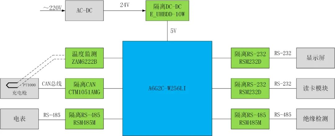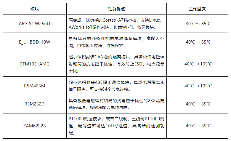 該方案使用了致遠電子的A6G2C系列Cortex-A7核心板、CTM系列CAN隔離、RSM系列RS485、RS232隔離、ZAM系列PT1000測溫,可以完全滿足上述要求。高隔離耐壓性能、高精度溫度采集、小體積模塊與核心板一體化設計,幫助用戶輕松快速實現(xiàn)功能,同時滿足復雜的電磁環(huán)境、寬泛的工作溫度范圍,有效保障充電環(huán)境的安全與穩(wěn)定。方案使用模塊及性能優(yōu)點如下: