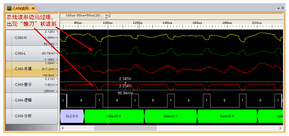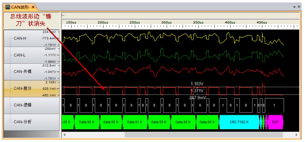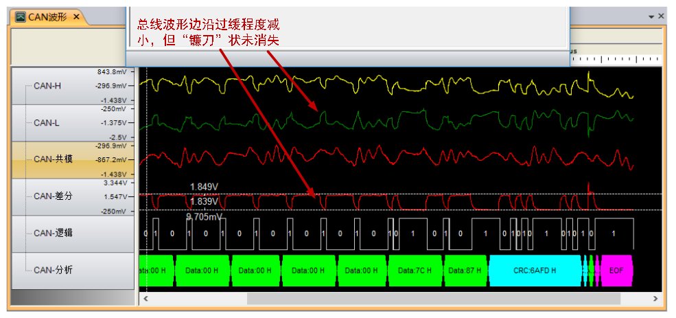 總線波形出現(xiàn)“鐮刀”狀的現(xiàn)象通常是由于總線上存在過大電容起的,根據(jù)電容的充放電時間公式可知t=RC,其中R可看成總線接口內(nèi)阻與終端電阻,C則是總線上的等效電容。